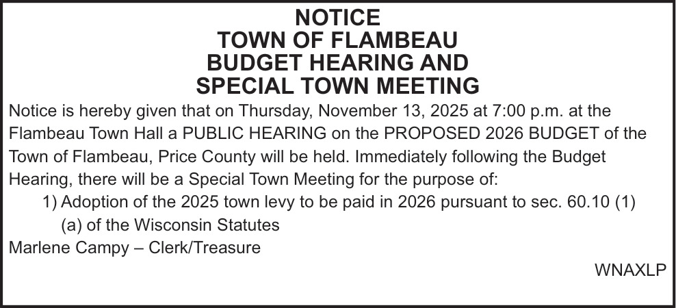 Nov 06, 2025. Town of Flambeau Public Notice Ads from Price County Review