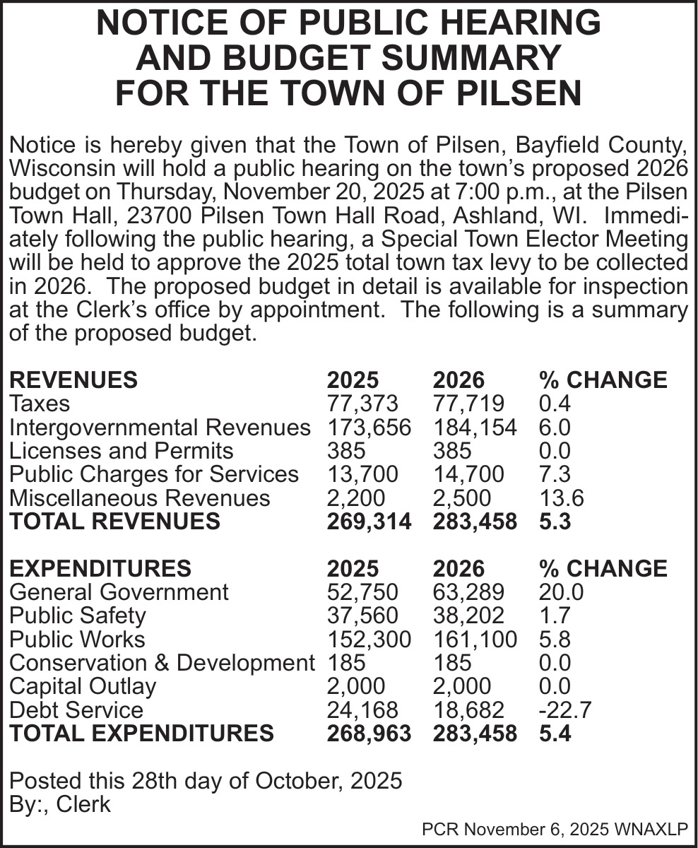 Nov 06, 2025. Town Of Pilsen Public Notice Ads from Ashland Daily Press