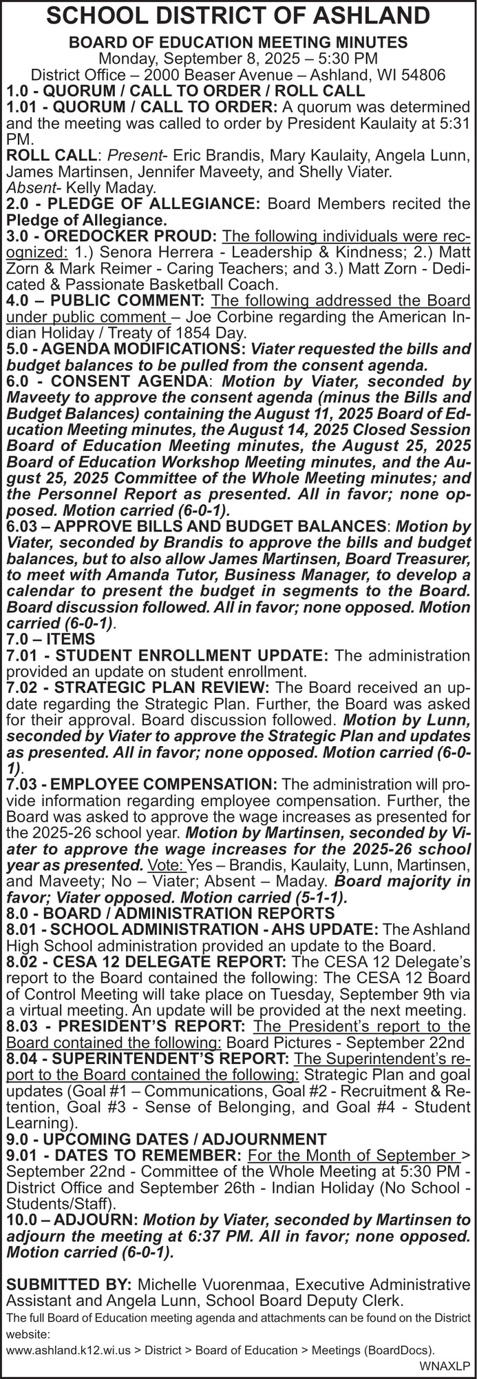 Nov 06, 2025. School District of Ashland Public Notice Ads from Ashland Daily Press