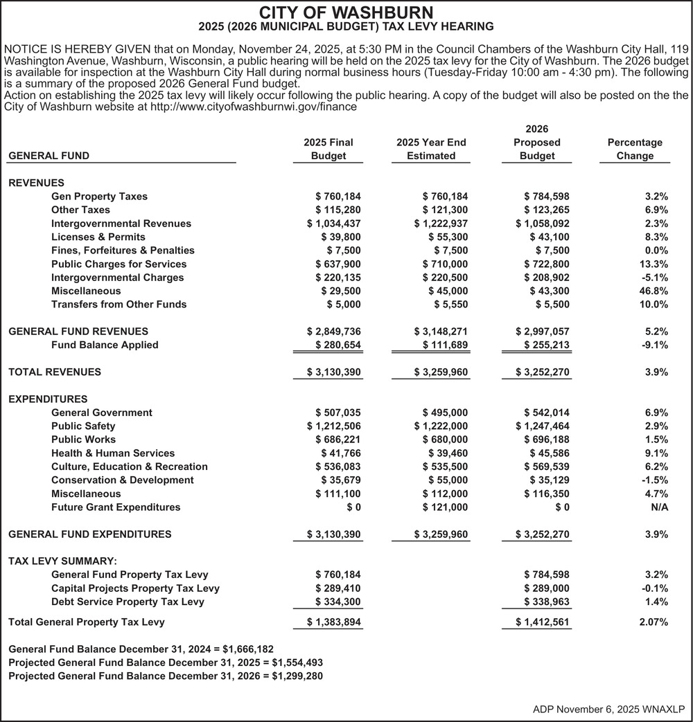 Nov 06, 2025. City Of Washburn Public Notice Ads from Ashland Daily Press