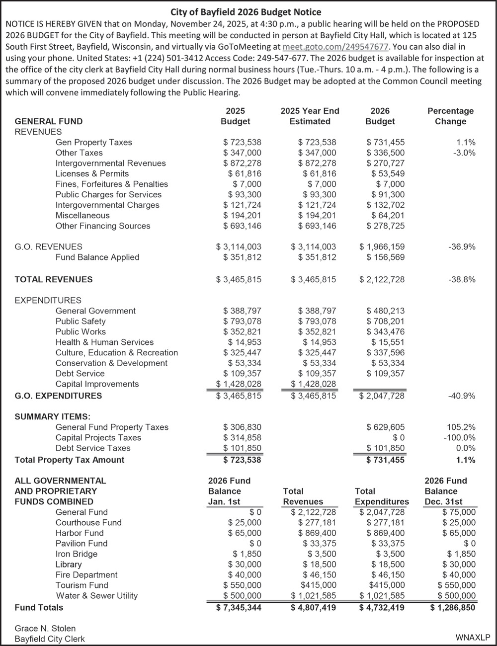 Nov 06, 2025. City of Bayfield Public Notice Ads from Ashland Daily Press