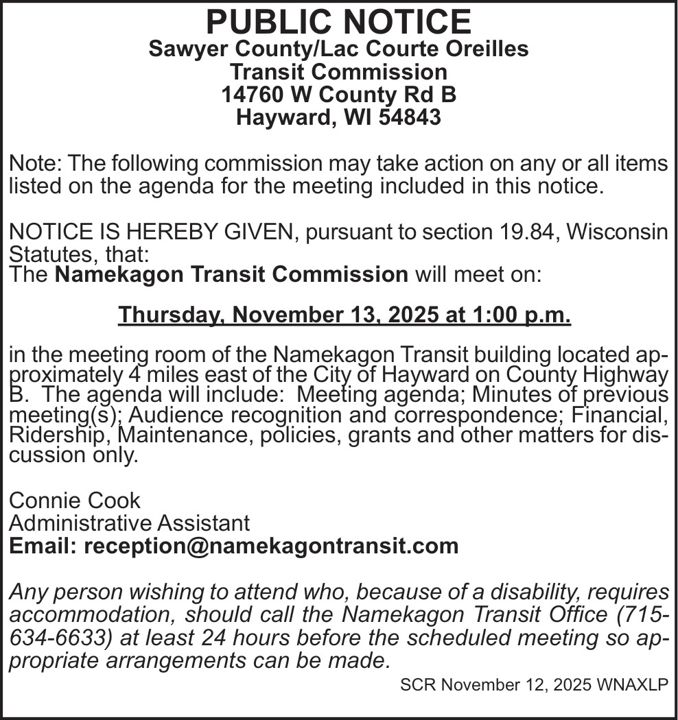 Nov 12, 2025. Saywer County Public Notice Ads from Sawyer County Record