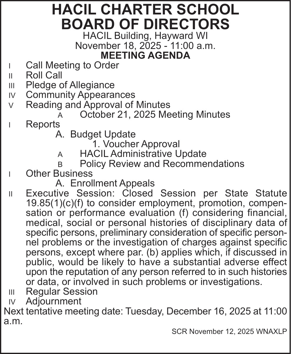 Nov 12, 2025. HACIL Charter School Public Notice Ads from Sawyer County Record