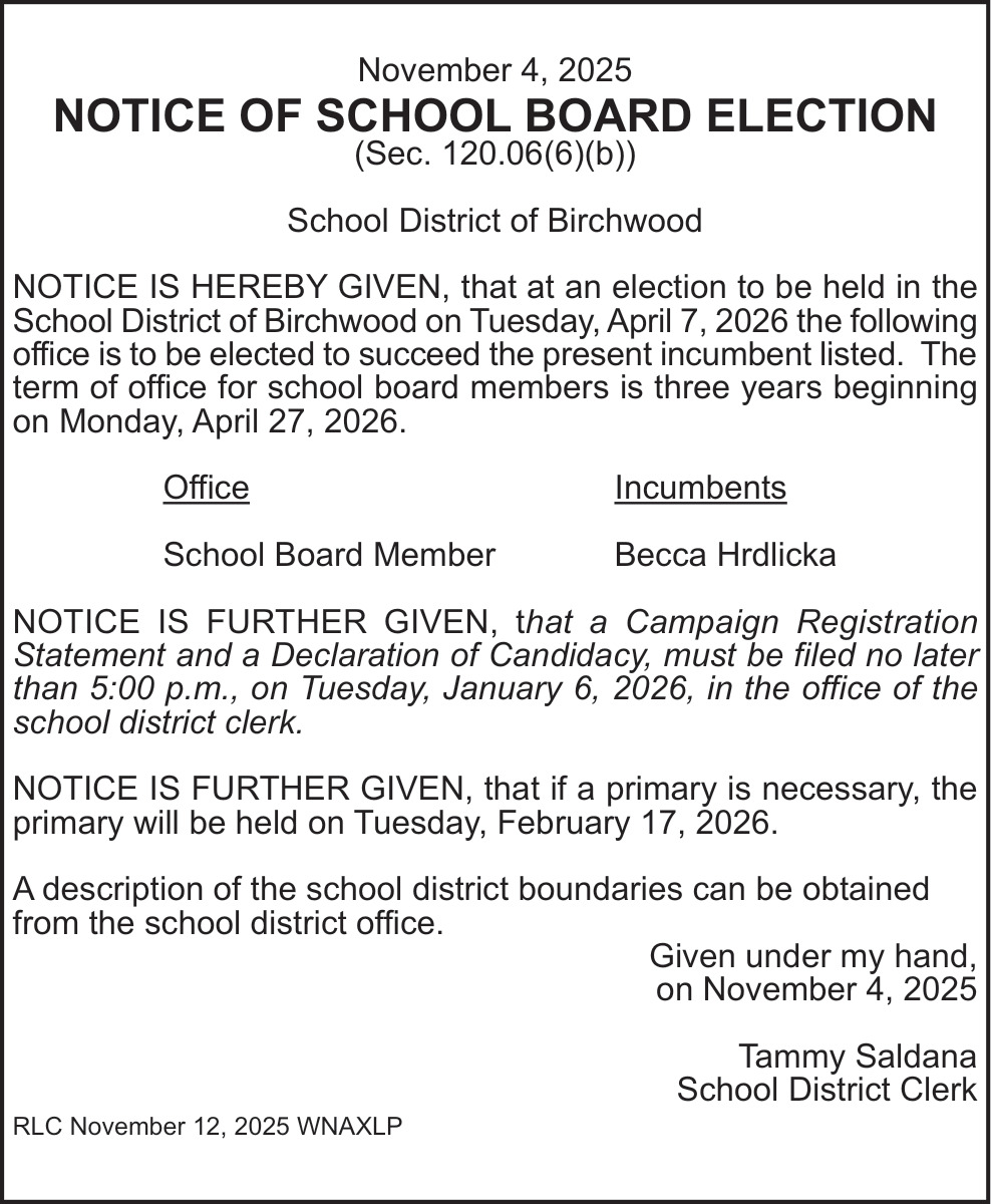 Nov 12, 2025. Birchwood School District Public Notice Ads from Rice Lake Chronotype