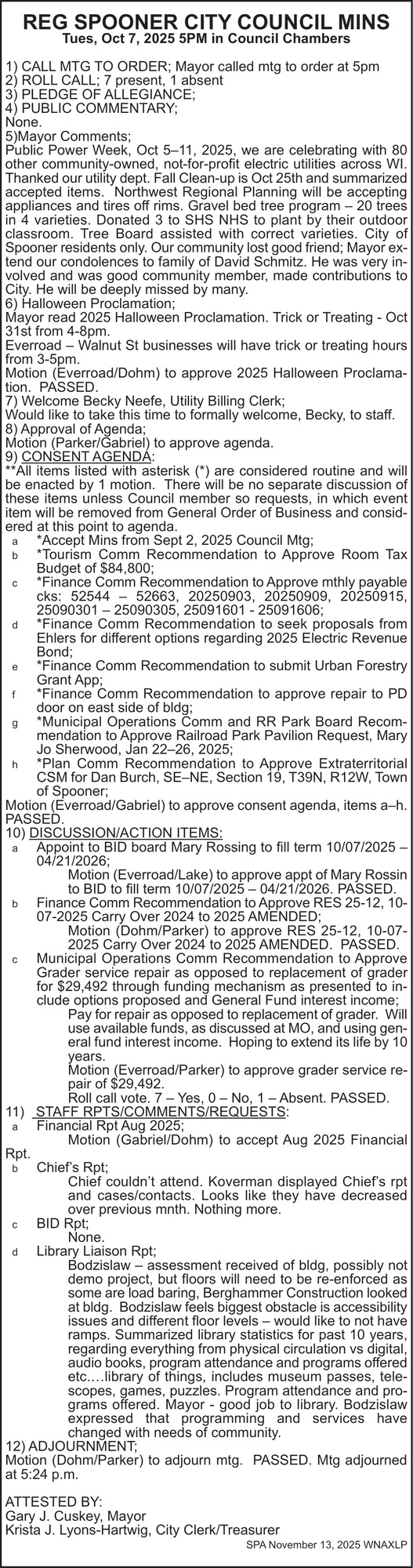 Nov 13, 2025. City of Spooner Public Notice Ads from Spooner Advocate