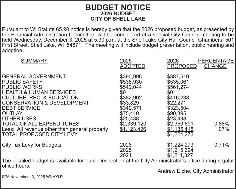 Nov 13, 2025. City of Shell Lake Public Notice Ads from Spooner Advocate