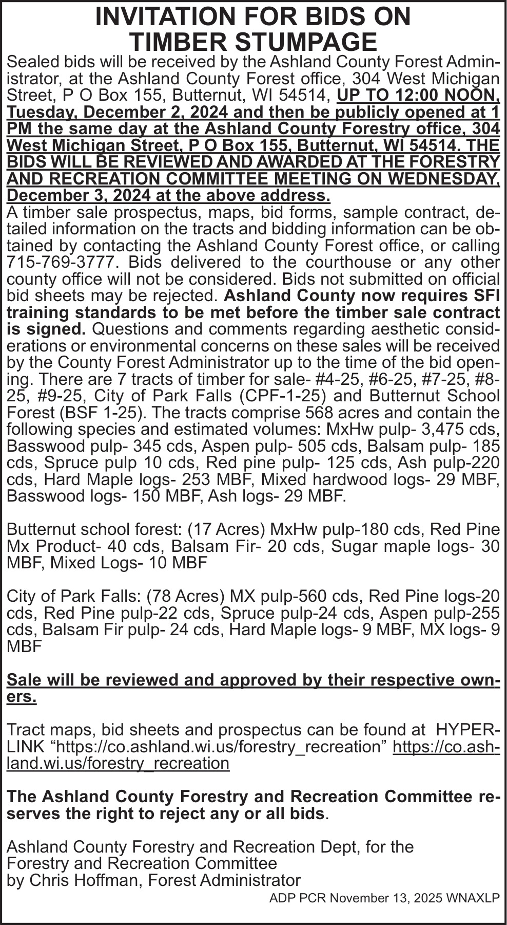 Nov 13, 2025. Ashland County Forest Office Misc Ads from Price County Review