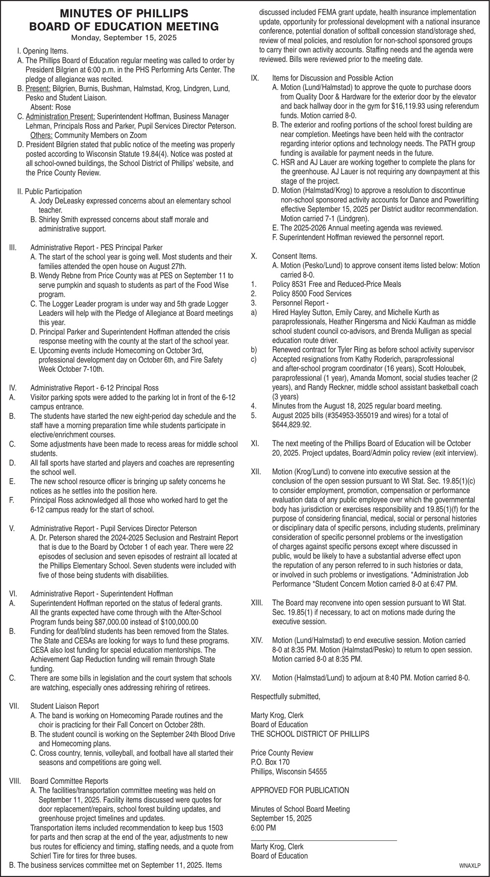 Nov 13, 2025. School District Of Phillips Public Notice Ads from Price County Review