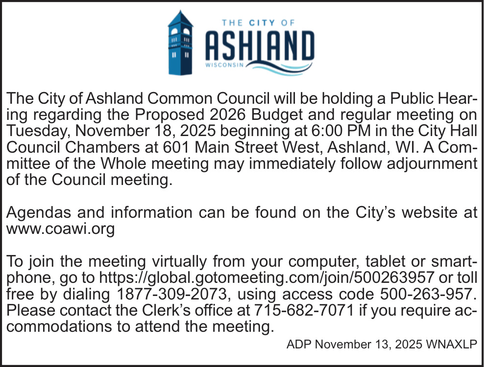 Nov 13, 2025. City Of Ashland Public Notice Ads from Ashland Daily Press