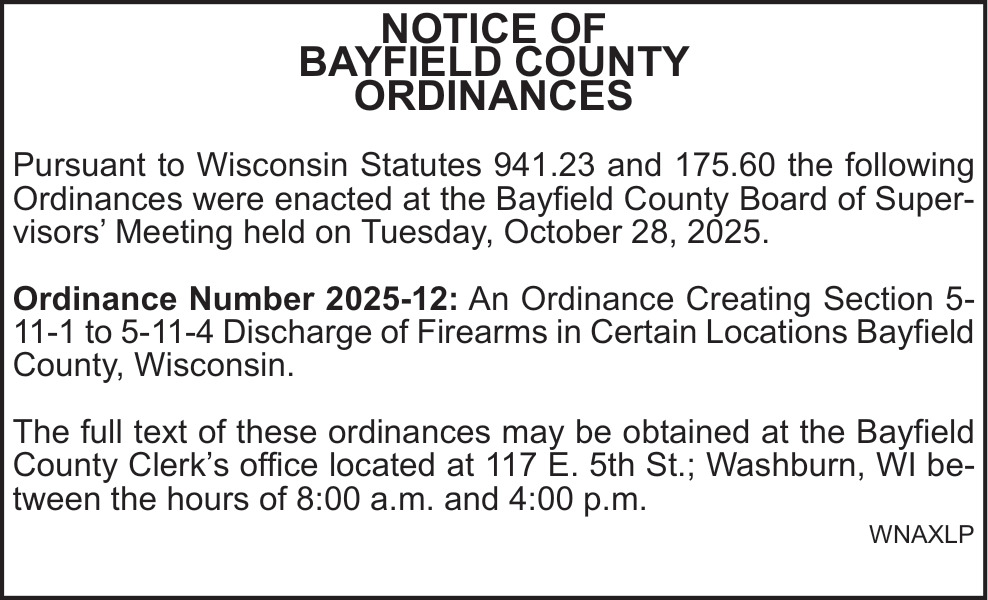 Nov 13, 2025. Bayfield County Public Notice Ads from Ashland Daily Press