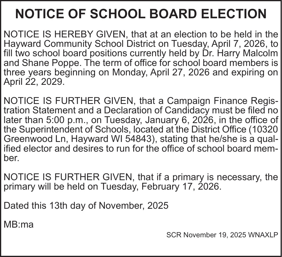 Nov 19, 2025. Hayward Community School District Public Notice Ads from Sawyer County Record