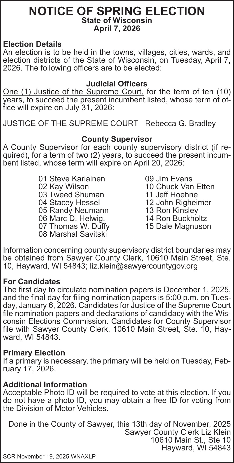 Nov 19, 2025. Sawyer County Public Notice Ads from Sawyer County Record