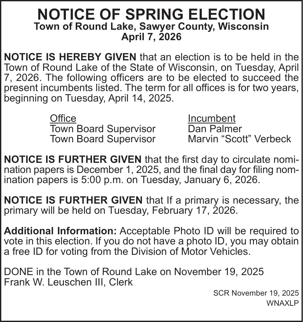 Nov 19, 2025. Town of Round Lake Public Notice Ads from Sawyer County Record