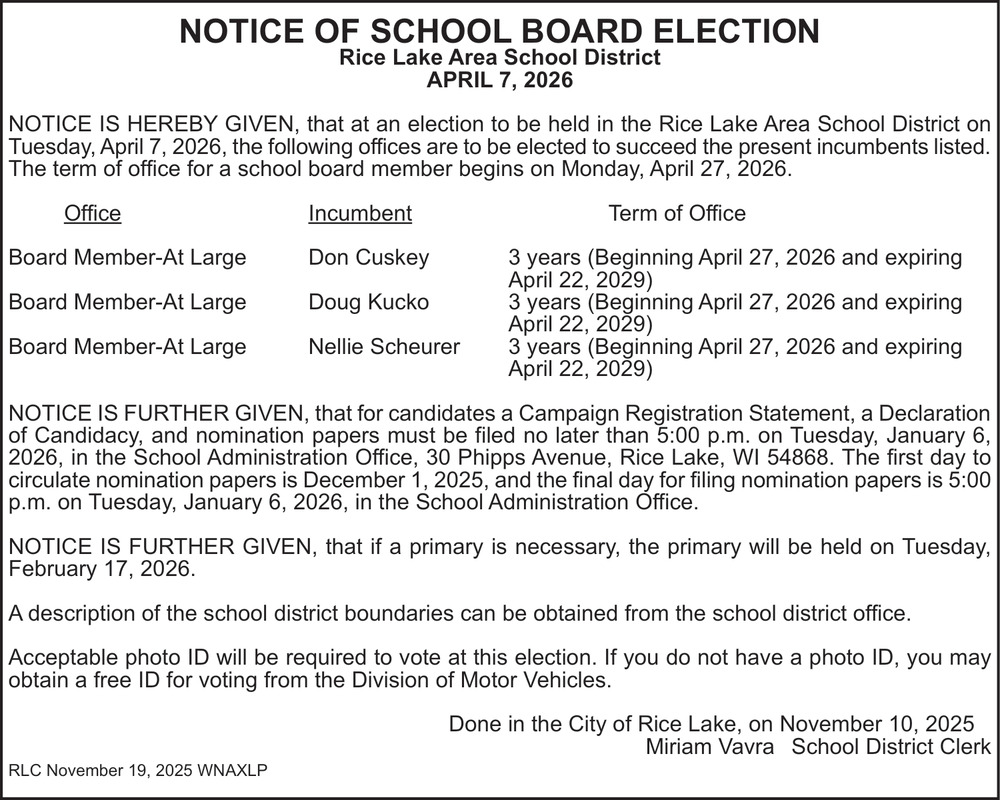 Nov 19, 2025. Rice Lake Area School District Public Notice Ads from Rice Lake Chronotype