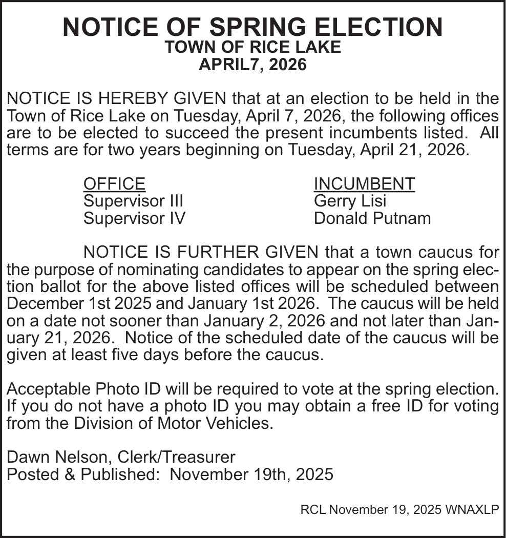 Nov 19, 2025. Town Of Rice Lake Public Notice Ads from Rice Lake Chronotype