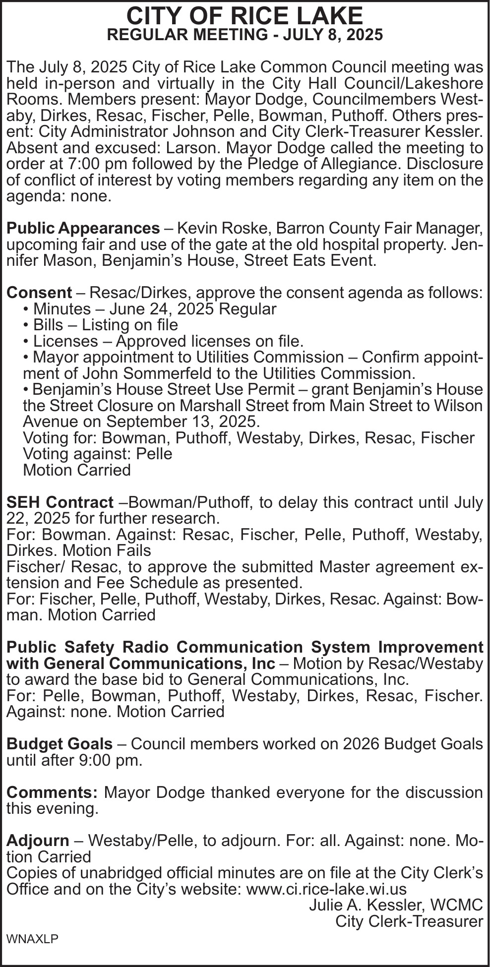 Nov 19, 2025. City of Rice Lake Public Notice Ads from Rice Lake Chronotype