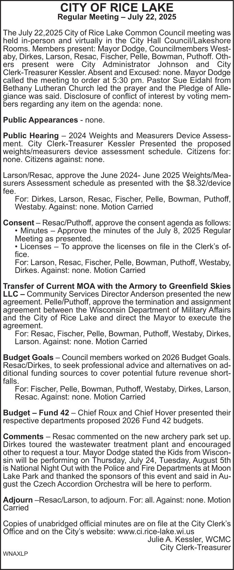 Nov 19, 2025. City of Rice Lake Public Notice Ads from Rice Lake Chronotype