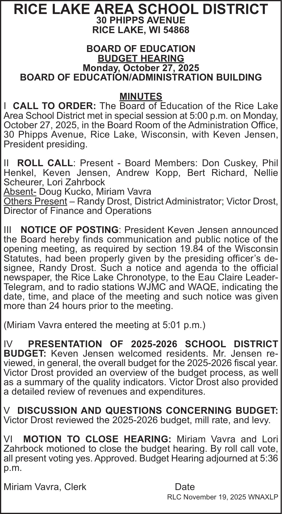 Nov 19, 2025. Rice Lake Area School District Public Notice Ads from Rice Lake Chronotype