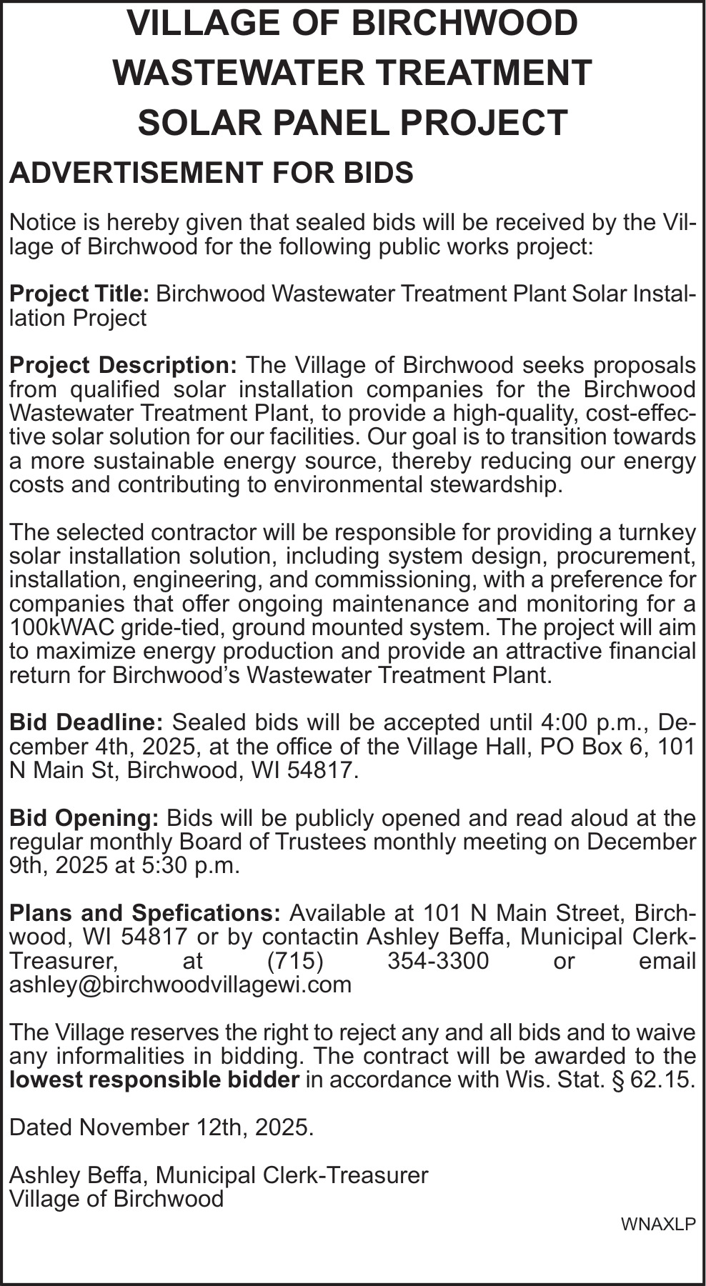 Nov 19, 2025. Village of Birchwood Public Notice Ads from Rice Lake Chronotype