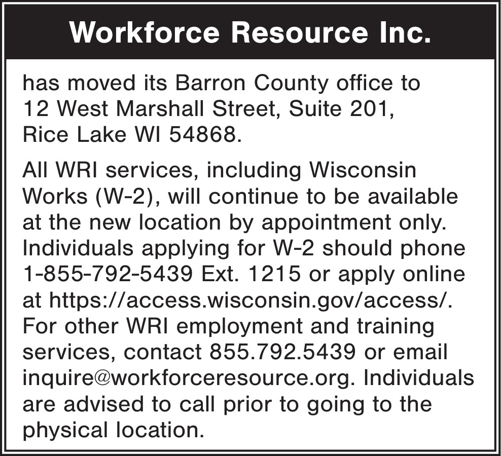 Nov 19, 2025. Workforce Resource Inc. Public Notice Ads from Rice Lake Chronotype