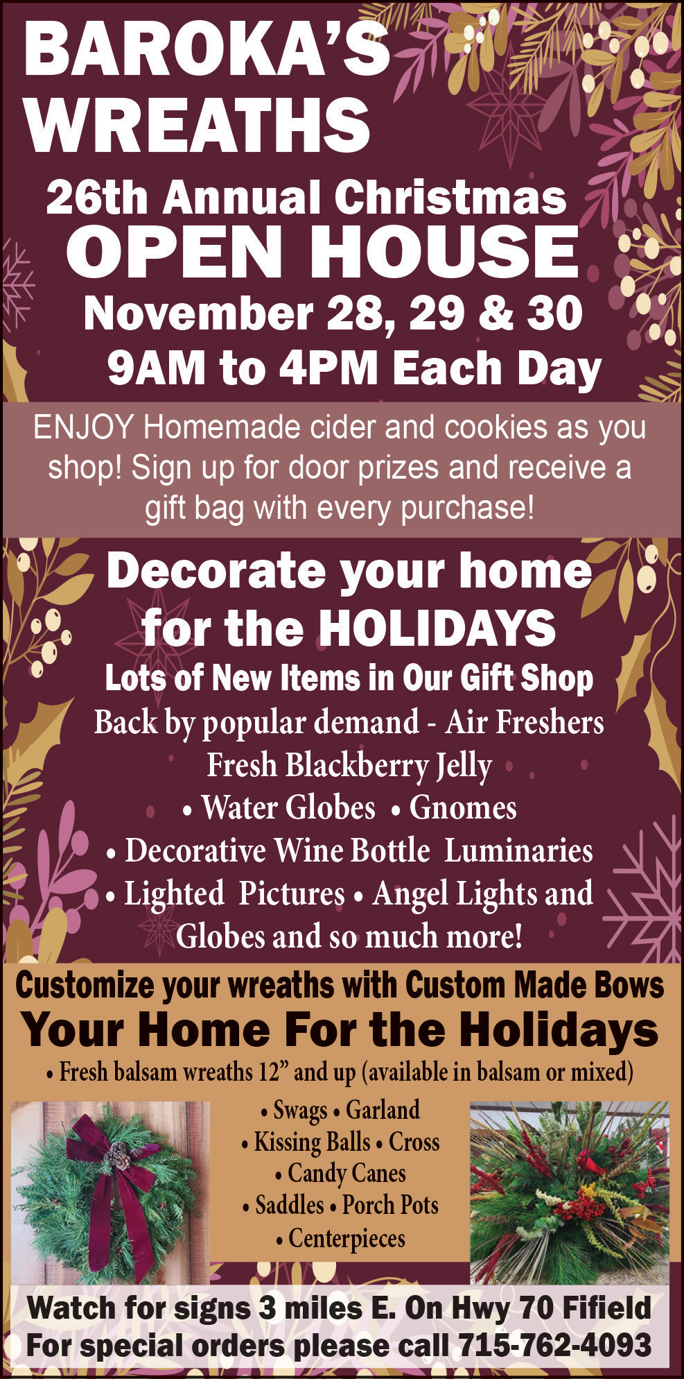 Nov 19, 2025. Baroka's Wreaths Home & Garden Ads from Ashland Daily Press