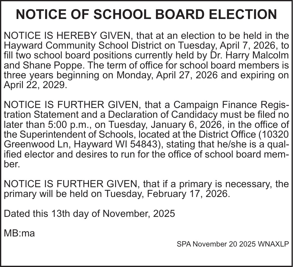 Nov 20, 2025. Hayward Community School District Public Notice Ads from Spooner Advocate
